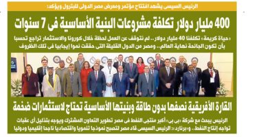 تتابع اليوم السابع فى عددها المطبوع الصادر غدا الاثنين، العديد من القضايا والملفات المهمة، منها: الرئيس السيسى يشهد افتتاح مؤتمر ومعرض مصر الدولى للبترول.. ويؤكد: 400 مليار دولار تكلفة مشروعات البنية الأساسية فى 7 سنوات