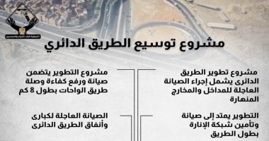 وتضمن الإنفوجراف أن مشروع توسيع الطريق الدائرى يتضمن صيانة طبقات الرصف من تقاطع شبرا / بنها الى محور 26 يوليو بطول 15 كم، وإنشاء طريق داعم من تقاطع صحراء الأهرام الى تقاطع طريق الواحات بطول 8 كم.