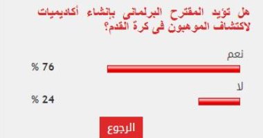 وأيد 76% من القراء المقترح البرلمانى بإنشاء أكاديميات لاكتشاف الموهوبين فى كرة القدم، بينما رفض 24% من القراء موضوع الاستطلاع.