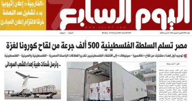تتابع اليوم السابع في عددها المطبوع، الصادر غدا، الاثنين، العديد من القضايا والملفات المهمة، منها تفاصيل استقبال الرئيس عبد الفتاح السيسي وفدا من رؤساء المجالس والبرلمانات العربية.. وتأكيد رؤساء البرلمانات العربية أن مصر قلب الأمة النابض، وأن قيادة الرئيس السيسى الحكيمة قهرت تحديات التنمية، إضافة إلى تسليم مصر السلطة الفلسطينية 500 ألف جرعة من لقاح كورونا لغزة، ونفى الحكومة تلاعب محطات الوقود فى عدادات اللترات للتربح.