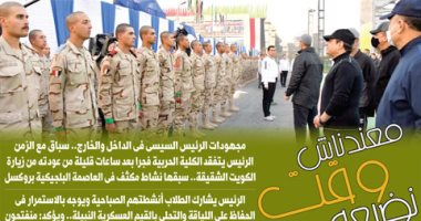 ـ معندناش وقت نضيعه.. مجهودات الرئيس السيسى فى الداخل والخارج.. سباق مع الزمن.. الرئيس يتفقد الكلية الحربية فجرا بعد ساعات قليلة من عودته من زيارة الكويت الشقيقة.. سبقها نشاط مكثف فى العاصمة البلجيكية بروكسل.. الرئيس يشارك الطلاب أنشطتهم الصباحية ويوجه بالاستمرار فى الحفاظ على اللياقة والتحلى بالقيم العسكرية النبيلة.. ويؤكد: منفتحون على كل الدول الكبرى وإقامة العلاقات المتوازنة والمعتدلة معها