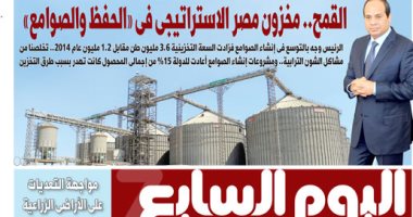 تنشر اليوم السابع فى عددها الصادر غدا، تفاصيل هامة حول العديد من الأحداث الجارية على الساحتين الداخلية والخارجية، أهمها: القمح.. مخزون مصر الاستراتيجى فى “الحفظ والصوامع”.. الرئيس وجه بالتوسع فى إنشاء الصوامع فزادت السعة التخزينية 6.3 مليون طن مقابل 2.1 مليون عام 2014.