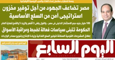 تنشر اليوم السابع فى عددها الصادر غدا السبت، تفاصيل هامة حول العديد من الأحداث الجارية على الساحتين الداخلية والخارجية، والتي تمثل أبرزها فى “مصر تضاعف الجهود من أجل توفير مخزون استراتيجى آمن من السلع الأساسية”.
