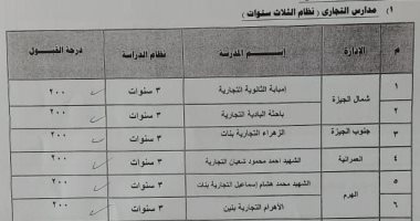 – 200 درجة لمدارس (إمبابة وباحثة البادية الثانوية التجارية بشمال الجيزة والزهراء التجارية بنات والجيزة الفنية المتقدمة بجنوب الجيزة والشهيد أحمد محمود شعبان بالعمرانية والشهيد محمد هشام إسماعيل بنات والأهرام التجارية بنين بالهرم وأوسيم التجارية المشتركة والراية التجارية بنات بكرداسة ومنشأة القناطر التجارية المشتركة بمنشأة القناطر والشهيد عبده مهدى رزق الله التجارية المشتركة بالحوامدية).