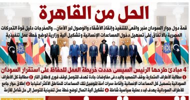 4 مبادئ طرحها الرئيس السيسى حددت خريطة العمل للحفاظ على استقرار السودان.. 1 مطالبة الأطراف المتحاربة بوقف التصعيد وبدء مفاوضات جادة تهدف للتوصل لوقف فورى لإطلاق النار.. 2 مطالبة جميع الأطراف السودانية بتسهيل كل المساعدات الإنسانية وإقامة ممرات آمنة لتوصيلها للمناطق الأكثر احتياجا.. 3 إطلاق حوار جامع للأطراف السودانية يهدف لبدء عملية سياسية شاملة.. 4 تشكيل آلية اتصال لوضع خطة عمل تنفيذية للتوصل إلى حل شامل للأزمة