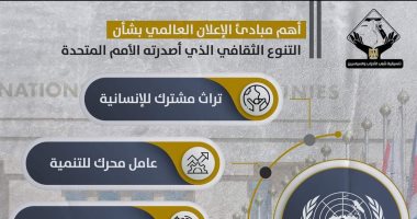 رصدت الصفحة الرسمية لموقع مقالات تنسيقية شباب الأحزاب والسياسيين، عبر موقع التواصل الاجتماعى فيس بوك فى إنفوجراف أهم مبادئ الإعلان العالمى بشأن التنوع الثقافى الذى أصدرته الأمم المتحدة، من بينها تراث مشترك للإنسانية وعامل محرك للتنمية ومن مصادر الإبداع وحقوق الإنسان هى ضمان للتنوع الثقافى والسياسات الثقافية تحفز على الإبداع.