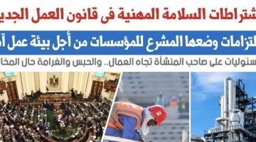 يرصد “برلمانى”، أحد إصدارات “اليوم السابع”، اشتراطات وضعها قانون العمل الجديد لمؤسسات العمل من أجل بيئة آمنة الخالية من المخاطر خاصة فى المنشأة الصناعية. وفيما ... اقرأ المزيد